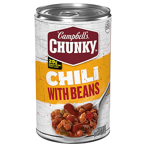 Campbell’s® Chunky® Chili with Beans isn’t just tasty—it's made to work as hard as you do. With never-ending big flavors and bold ingredients, this comfort food classic is capable of fueling the heartiest appetite. This ready-to-eat chili is crafted with hearty ingredients like kidney beans, seasoned beef and pork, and red and green peppers in a delicious tomato puree. Each serving has 13 grams of protein. Just pop this chili in a microwave-safe bowl, heat and enjoy. Or, warm it over the campfire on your outdoor adventures. Whether you’re looking for quick and easy to microwave chili for home or something to take on the go, Campbell’s® has you covered. The chili can is recyclable for easy disposal. Enjoy Campbell’s® Chunky® Chili with Beans.