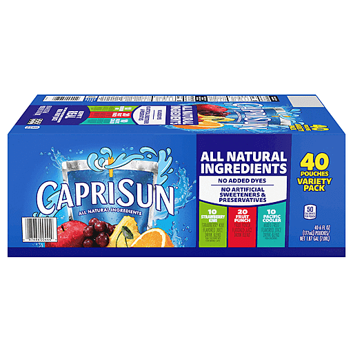 Grab a little juicy freedom with Capri Sun Fruit Punch, Strawberry Kiwi and Pacific Cooler Flavored with other natural flavor Juice Drink Blends. Kids will love the taste of our Capri Sun, made with a new and improved formula. Made with the all-natural sweetener, monk fruit, our juice drink blend variety pack features an assortment of fun flavors that are joyfully refreshing. We never add artificial flavors, colors, preservatives or high-fructose corn syrup to our pouches. Our 40 count variety pack contains 20 Fruit Punch, 10 Strawberry Kiwi and 10 Pacific Cooler flavored juices. Each 6 fluid ounce pouch comes with a straw so they're ready for kids to squeeze and sip. Unleash kids' independence with a ready-to-drink Capri Sun.