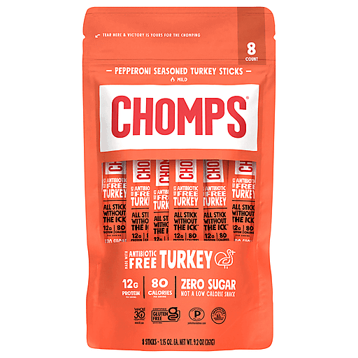 Chomps Turkey Sticks, Zero Sugar, Pepperoni Seasoned, Mild 8 ea