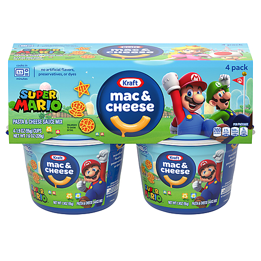 Help yourself to a cup of comfort. Kraft Mac and Cheese Dinner Cups with Super Mario Power-Up pasta shapes are easy and ready in just minutes. Kids and adults love the rich taste and creamy texture of macaroni pasta with cheesy goodness. Easy mac cups include macaroni pasta - shaped like Fire Flower, Super Star and Super Mushroom - and original flavor cheese sauce mix so you have everything you need to make delicious, quick mac and cheese by just adding water. Looking for microwave meals, kids meals or instant mac and cheese? Our macaroni cups are a great choice. With no artificial flavors, preservatives or dyes, our microwavable macaroni and cheese cups make a perfect snack or a classic meal side. Preparing our microwavable food is a breeze. Just combine the pasta with water up to the fill line in the cup, microwave for 3.5 minutes and stir in the cheese sauce mix. Each sleeve includes four 1.9-ounce microwavable meals. Stir up new ways to enjoy Kraft Mac n Cheese by adding protein, hot sauce, condiments, or seasonings to make it your own. A wholesome tradition, Kraft Mac & Cheese has been bringing generations together since 1937. Kraft Mac and Cheese inspires the positive power of comfort, so keep your pantry stocked with our dinner sides and enjoy cheesy goodness anytime.