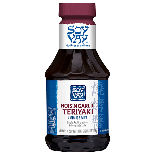 Soy Vay Hoisin Garlic Teriyaki Marinade and Sauce is bursting with distinct Asian flavor accents. It is made with high quality ingredients and infused with garlic to give it a sweet and salty, deliciously tangy, garlicky flavor. This versatile, shelf-stable marinade and sauce is Kosher, Tree Nut-Free and preservative free. Use it as a marinade for meats or a dipping sauce for a variety of appetizers. It also makes a delicious sauce for all sorts of meats and vegetables. Whether you are grilling, baking, broiling or stir frying, with Soy Vay, the meal ideas are endless and the taste is great.