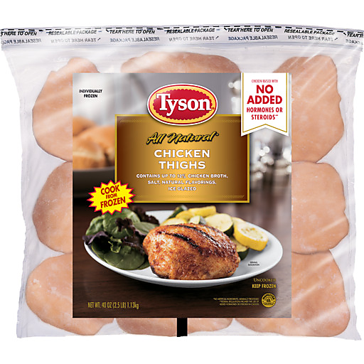 There's nothing like cooking from scratch, especially when you start with Tyson Individually Frozen Chicken Thighs, Bone-in. Our all-natural* chicken is juicy and tender with 14 grams of protein and 0 grams of trans fat per serving. Perfect for grilling and roasting, simply cook and serve our chicken thighs with BBQ sauce for a quick and delicious weeknight dinner. Includes one 2.5 lb package of individually frozen chicken. Everything seems to turn out a whole lot better when you just keep it simple. No nonsense. Just stick to the good stuff. The 100% real stuff that makes life, and chicken, great. . Keep it real. Keep it Tyson. *Minimally processed, no artificial ingredients.
